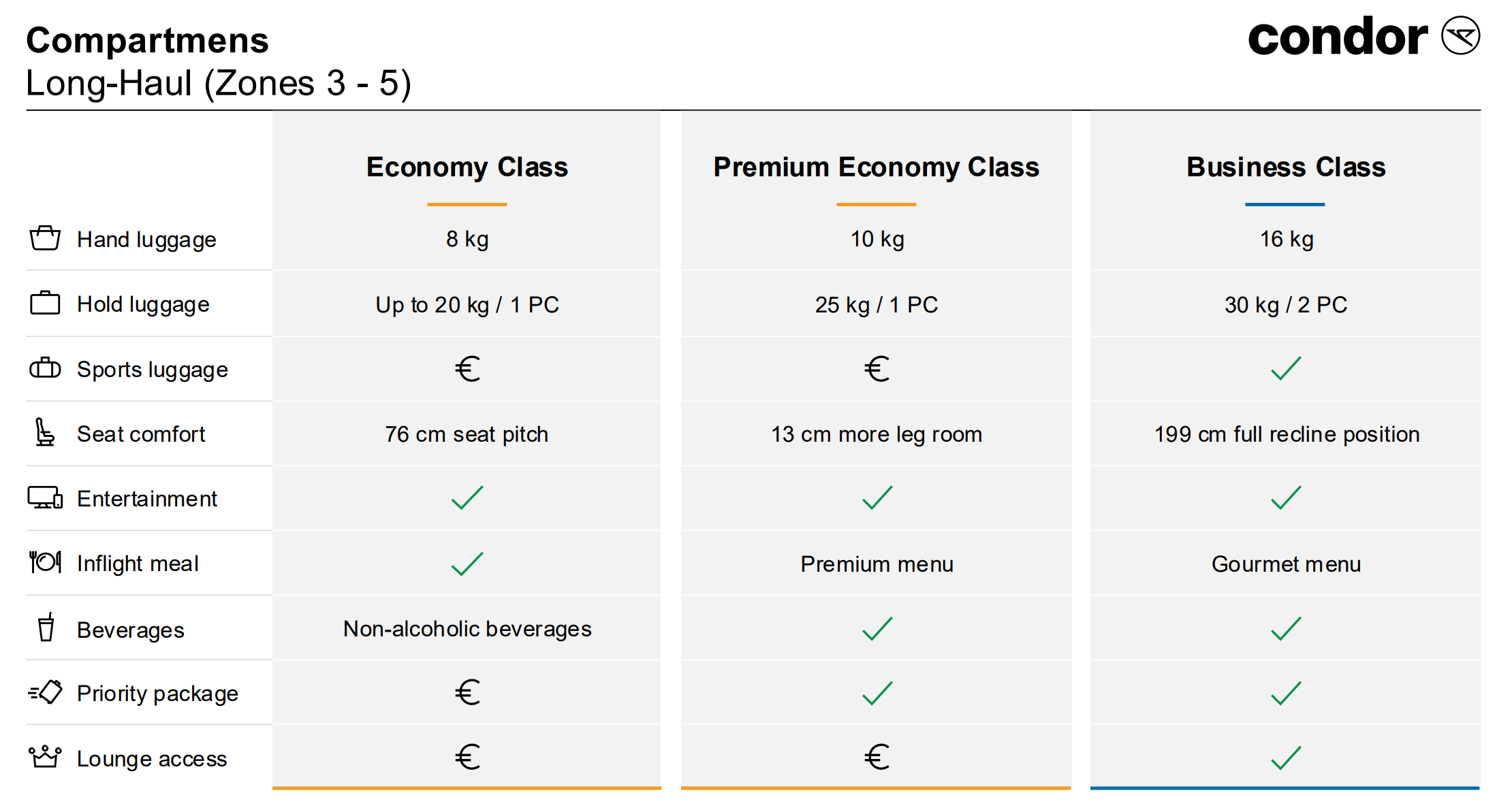 | Make your traveler's experience even more enjoyable. Our Premium Economy Class offers additional legroom and wider seats for a comfortable journey. Find more space for relaxing, as well as exclusive cabin features such as tasty meals, premium snacks, and a complimentary drink. Only available on long haul flights, this upgrade will guarantee a unique flying experience. | | | | | | | Take the flying experience to the next level with an upgrade to Business Class. This premium class provides superior comfort with additional legroom, wider seats, and exclusive cabin features. Enjoy delicious meals, premium snacks, and drinks, and much more. | | | | | | | Experience the Difference: Our Best Seats on the Plane | In the front row of the Airbus A330neo, four exclusive seats for even more first-class comfort with special extras - our Prime Seats. Here, enjoy a larger reclining seat with expanded legroom. For even more convenience, a special travel kit and cozy pajamas are available. | The Prime Seat is perfect for traveling as a couple, because your travel companion can sit in the opposite seat. The shared table in the middle invites you to eat, play or work. On the over 24-inch screen, you can enjoy our entertainment program in 4K resolution. With the included Internet package, you'll stay online the whole time. | | | | | | | | | |