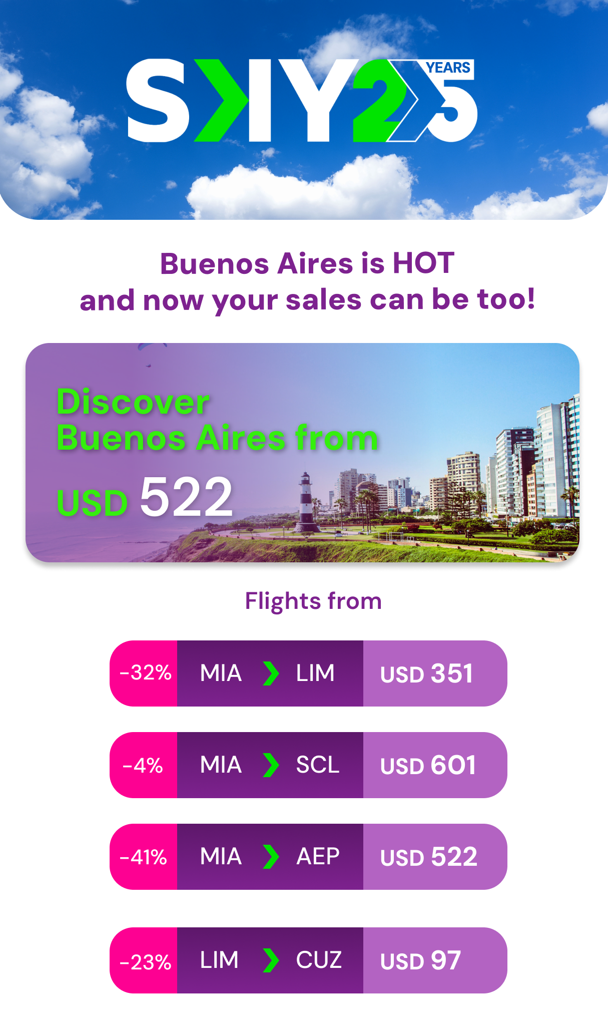 Your Argentina Adventure Starts Here: Fly with SKY! March 13, 2026 ← BackBuenos Aires & Beyondare waiting for you!Fares valid from March 9 - 15, 2026